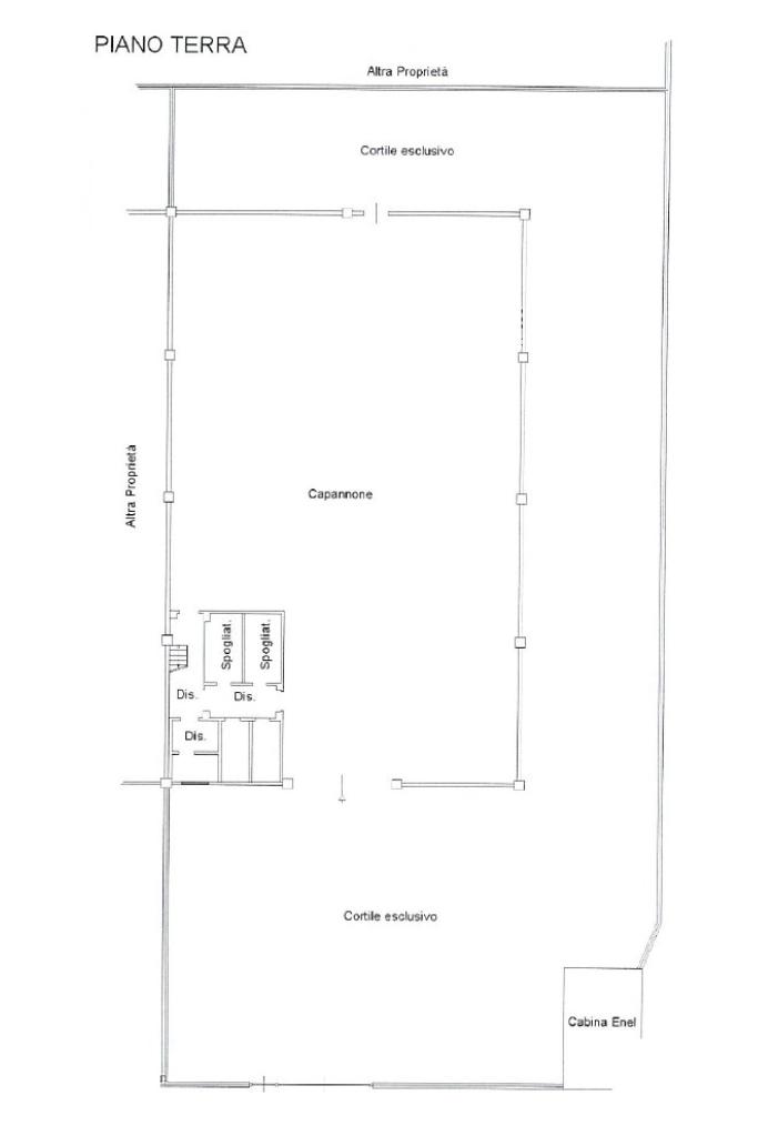 La soluzione proposta in affitto dispone di una superficie calpestabile di circa 400 metri quadrati, di cui 40 metri quadrati adibiti a spazio direzionale, il tutto disposto lungo un'unica campata al pian terreno di un edificio di un piano. Il capannone raggiunge un'altezza di 6,57 metri con un'altezza sotto trave di 5,1 metri, dispone di un sistema antincendio composto da porta tagliafuoco e uscita d'emergenza. La struttura è raggiungibile tramite portone d'accesso di circa 4,36 metri che affaccia su tre locali, liberi da pilastri. Lo stabile è servito dagli impianti elettrici e d'illuminazione, gode inoltre di un servizio igienico privato completo di comode docce. Esternamente troviamo ulteriori 600 metri quadrati di area recintata, libera su tre lati e accessibile tramite un cancello di circa 7 metri con annessi un passo carraio e un accesso carraio. La proprietà risulta possedere tetto in eternit.