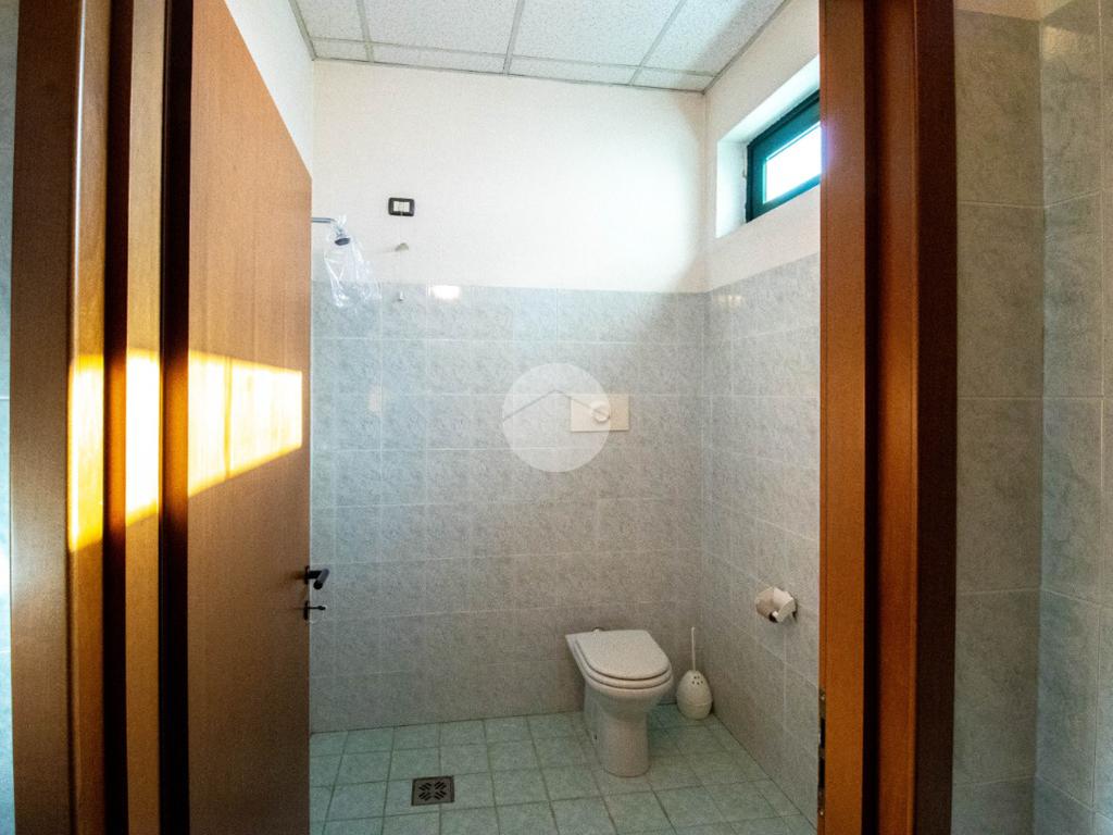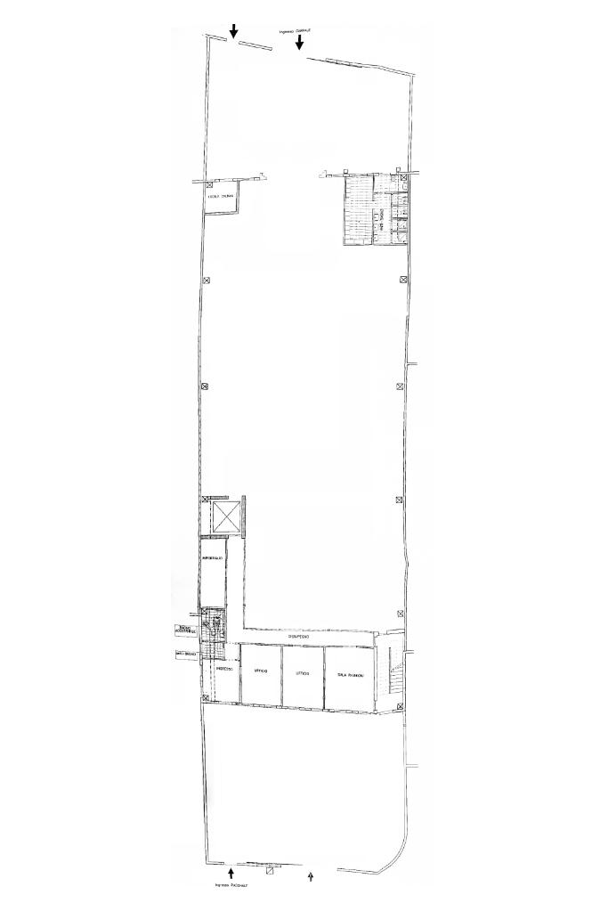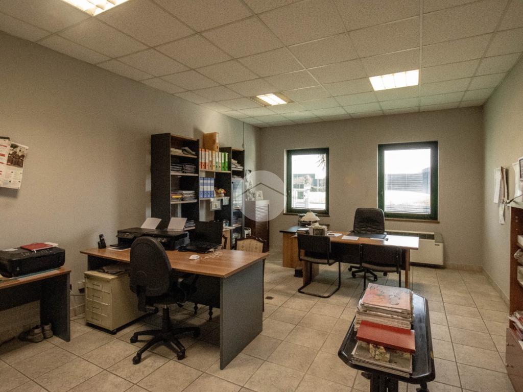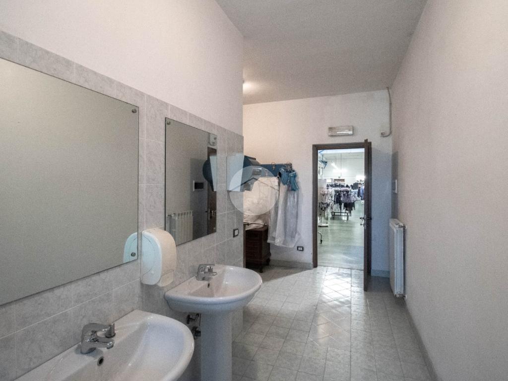 - Al piano terra troviamo circa 840 metri quadrati di capannone, di cui 800 metri quadrati di spazio commerciale e due locali adibiti ad uffici, disposto interamente al piano terra lungo un'unica campata con annessi quattro servizi igienici privati, di cui due a norma disabili, completi di mensa, area spogliatoio e comode docce;